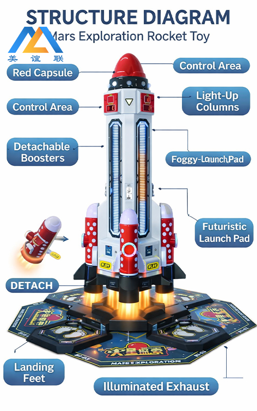 “Mars Exploration” is our company’s newly developed mid-to-high-end indoor interactive device for parent-child engagement. Featuring a rocket-inspired design with a striking red color scheme and sleek lines that mimic the dynamic force of a launching spacecraft, this innovative product boasts a sturdy structure. When installed in an arcade, it creates a unique visual spectacle that instantly captures players’ attention through its bold, eye-catching appearance. With exceptional quality, precise positioning, and intuitive gameplay, this innovative competitive lottery machine offers a unique experience. Four players can compete simultaneously in online matches, interacting through designated positions within set time limits to determine rankings. Its comprehensive coin replenishment system ensures seamless rapid coin collection, making it an essential revenue-generating solution for any gaming venue. Medium-sized machinery products; The game has novel and exciting gameplay, strong human-computer interaction, and rich leisure entertainment; The design is beautiful, the pattern is bright and delicate, the material is solid; Using integrated circuit, built-in program, stable performance, safe and reliable; Adapt to general type lotteries;
